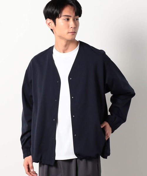 速乾性とストレッチ性に優れたカノコ素材を使用したノーカラーブルゾン。軽い素材感で夏の直前まで羽織れるのもポイント。同素材でのセットアップやアンサンブルでのコーディネートもできます。・デザイン素材の特性を活かしたカーディガンのような羽織れてインナーにも使える要素を入れたブルゾン。フロントをスナップ釦にする事で軽さと開け閉めをしやすくしています。脇にはファスナー付きポケットを付ける事でアウターとして使いやすくしています。袖口、裾には素材感のあるパイピングを施してアクセントにしています。裾はコードで絞ることができてコーディネートに合わせてシルエットを変えることが出来ます。後ろはにはメッシュ素材の別生地を切り替える事で通気性を良くして長いシーズン着用出来るようにしています。裾に付けた同色のラバーワッペンもポイントです。・シルエットゆったりとしたサイズ感になっているので、スウェットやフーディなどの肉厚なアイテムもインナーに着用することができます。素材にハリがあるのでフロントを開けた時にもシルエットに立体感が出るのもポイントです。・ファブリック【圧縮マイクロカノコ】スポーツブランドでも採用されている吸水速乾機能のある素材を使用しています。ポロシャツでお馴染みの鹿の子素材を極限まで圧縮する事でニットのような伸縮性とカットソー素材には出せない滑らかな肌触りに仕上げています。シワになりにくく乾きやすいイージーケアも特徴です。吸水速乾機能も付いているのでスポーツ、アウトドアシーンにもおすすめです。・スタイリングスウエット、Tシャツなどカジュアルアイテムに相性抜群ですが、素材の表面感がきれいなのでスラックスなどきれい目なボトムと合わせたコーディネートも新鮮です。同素材でパンツやTシャツなど展開しているのでアンサンブルやセットアップで着用するのもおすすめです。※ご家庭でのお洗濯可能な商品です。詳細、取り扱い方法は商品に付いている品質表示、アテンションタグを御確認下さい。<商品お気に入りの登録>完売しているカラーの再入荷通知や、ラスト1点、セールの通知をお知らせいたします。<ブランドお気に入り登録>新商品や再入荷などいち早くブランドの情報を受け取ることができます。*****************裏地:なし伸縮性:あり光沢感:なし生地の厚さ:普通透け:なし*****************<スタッフ着用コメント>本社 Hさん身長:178cm/体重:66kg/体型:普通/普段サイズ:48(L)/着用サイズ:48(L)サイズ感:ゆったりしていて厚手のインナーも着用できる。素材感:やわらかくて軽い、さらっとしている。着心地:常にさらさらしていて快適な着心地。