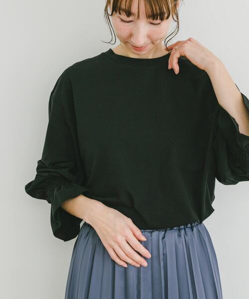 カットソー素材ながら、ブラウスのように見えるきれいめデザインが魅力の一枚。程よい光沢感と袖のギャザーが女性らしさをプラスし、トレンド感のある着こなしを叶えます。シワになりにくく、お手入れが簡単なのも嬉しいポイント。オン・オフ問わず活躍する着回し力の高いトップスです。【2025 Spring/Summer】【25SS】※商品画像は、光の当たり具合やパソコンなどの閲覧環境により、実際の色味と異なって見える場合がございます。予めご了承ください。※商品の色味の目安は、商品単体の画像をご参照ください。▼お気に入り登録のおすすめ▼お気に入り登録商品は、マイページにて現在の価格情報や在庫状況の確認が可能です。お買い物リストの管理に是非ご利用下さい。素材感透け感 : ややあり(OFF)伸縮性 : ややあり裏地 : なし光沢 : なしポケット : なしFREE