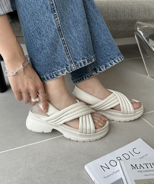 \ ふわっと履ける厚底♪ /安定感抜群のクロストラックサンダル。全体的にふわふわとしたパデット素材を使用しており、ぴったり足にフィットします。トレンド感のある5cmの厚底でボリュームがあり、スタイルアップ効果も♪クッション性のあるソールで楽に履いていただけます。また軽量の為、長時間のお出掛けにもおすすめです。デニムやスポーティーなコーデにもぴったりですし、スカートやワンピースと合わせて程良いカジュアル感をプラスするのも◎《point》・クッション性のあるソールで足元から快適に◎・アクセントになる厚底デザインでスタイルアップ効果も♪・シンプルなデザインで幅広いコーデに合わせられる【カラー表記について】システム上の都合により、一部カラー名がサイト表記と異なる場合がございます。【入荷時期について】入荷日ごとに販売数量が決まっているため、オンラインでは完売後に次期納期の数量にて予約販売を行っております。店舗入荷時期と予約商品のお届け時期が異なる場合がございますので、予めご了承ください。※追加入荷のある商品もございますので、詳しい店舗入荷時期に関しましてはお近くの店舗へお問い合わせください。※店舗の在庫状況に関しましては、こちらのページに記載されている「店舗在庫」から確認にしていただけます。「在庫あり」の表記でも、お取り置き分などでお客様に販売できない場合がございます。※予約商品でも、店舗では追加がない場合もございます。ご了承ください。※初回予約商品でも配送処理が発生するため、店舗より遅れてのお届けとなる場合がございます。
