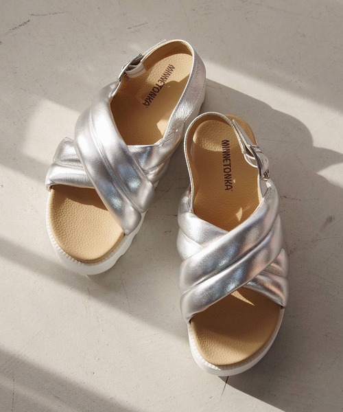 【めざましテレビ「イマドキ」で紹介されました!】大人ベージュが新登場!足首を包み込む太いクロスベルトが、足に安定感をもたらしてくれるパフィーサンダル。ボリューム感たっぷりのソールが足裏へのクッション効果が疲れを軽減し、長時間の歩行も快適です。パフィーなデザインが、抜け感と柔らかさをプラスしてくれます。一部がゴムになったバックストラップが、足にしっかりフィットし、脱ぎ履きが簡単です。5サイズ 21.5-22.0㎝6サイズ 22.5-23.0㎝7サイズ 23.5-24.0㎝8サイズ 24.5-25.0㎝9サイズ 25.5-26.0㎝サイズ感甲幅:20㎝(外側で測定)ヒール高:6cm底幅:9cm重量(片足):300g 6インチにて測定。MINNETONKA1964年ミネソタ州ミネアポリスで創業。1980年代後半にブレイクしたモカシンの代名詞ブランドとして、メンズ・レディース問わず世界中の人から愛されている老舗ブランドです。注意ハンドメイドのため大きさやハンドステッチなどのバラつき等ほぼ全ての商品において見受けられます。ハンドメイドならではの味・風合いとして、ご了解の上ご購入下さいますようお願い致します(特に大きく目立つものは検品の際に除外しております)上記の理由によるキャンセルはお客様ご都合となります。また、メーカーにより「製造工程上あり得ない」と判断される不良品に関しては、返品をお断りする場合がございますのでご了承下さいますようお願い致します。傷については靴の製造上やむを得ないものがございますことをご了承の上お求め下さいませ。着用に支障の無い傷や輸入による箱のつぶれ、汚れも 不良品としてのご返品理由の対象外とさせていただきます。靴の試し履きは室内で試着していただきますようお願いいたします。