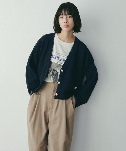 オンオフ使いやすいツイードカーディガンが新色も増えて再登場! ーーー 清涼感のあるツイード調のカーディガン オンオフ兼用でレディにも、カジュアルにも。 ーーー 【デザインと特徴】 ツイード調のオリジナル編地を使用したVネックカーディガン。 襟端やポケット端、袖口端にフリンジディティールつけることで、 甘くなりすぎないようアクセントを。 ツイード素材に映える金ボタンで、高見えします。 【素材特徴】 ツイード感のあるカノコ編地を採用。 ツイード感は保ちつつ、清涼感のある素材で作りました。 凹凸感の出る糸にラメをプレーティングしております。 【スタイリング】 オンオフ兼用でお使いいただけます。 お仕事では、スラックスパンツやタイトスカート、Aラインスカートに。 デイリー使いでは、デニムのようなカジュアル感のあるアイテムとの相性も◎ 【洗濯可否】 洗濯機での洗濯が可能です。 --------------------------------------------------------- 《インフォメーション》 ◆商品のお気に入り登録 ♡をクリックで気になるアイテムをお気に入り登録していただくと、 以下の通知を受け取ることができます。 ・入荷 ・再入荷 ・ラスト一点 ・セール対象時 ◆ブランドのお気に入り登録 新商品や再入荷、セール、クーポン配布などのお得な情報を受け取ることができますので、是非ご登録ください♪ 公式Instagram >>> 【@apartbylowrys 】 おすすめアイテムや新作情報、" ショップニュース "を更新中! ぜひフォローしてみてくださいね^^ ※ご注文いただいた予約商品のお届け時期の確認は、注文履歴ページより行えます。