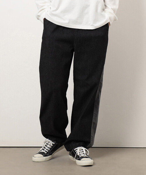 《デザイン》 2024年SS3月に展開し大好評だったデニム切替パンツがデザインをリニューアルして再登場。前回好評であったシルエットはそのままに、今回は単色でのグラデーションにして、サイドのラインをブラッシュアップしています。 どこか懐かしさの漂うトレーニングウェアをイメージしたレトロな雰囲気に仕上げています。 太めストレートのシルエット、裾にはドローストリングがついており、 絞るとテーパードジョガーパンツのような雰囲気でもスタイリングをお楽しみいただけます。 単品で着ていただくのはもちろん、同素材でつくるストレッチデニム切替ブルゾン(商品番号:55-01BK05-205)とセットアップで着ていただくのが一番おすすめです。 《素材》 <ケミカルウォッシュ/64>:レーヨン混ストレッチデニム 柔らかいタッチが特長のレーヨン混ストレッチデニムです。 レーヨン混紡による落ち感があり、綿100%の素材よりも断然に柔らかくごわつきが無いので着心地は抜群です。 デニムでありながらも綾目が細かく繊細なので、上品な表面感も特長です。 <ブラック/05>: T/Cストレッチデニム 綿とポリエステルの混紡糸を使用した春夏にぴったりな軽さの感じられるストレッチデニム素材です。 綿は吸湿性はもちろん保温性にも優れているので、1年中快適に着用していただけます。 裏地:無し 伸縮性:有り 光沢感:無し 生地の厚み:普通 ※画像の商品はサンプルとなりますので実際の商品と仕様、加工、サイズが若干異なる場合がございます。 ※こちらの商品はFIVE FOXes独自の採寸方法となっています。 本サイトのサイズガイドと採寸方法が異なる場合がありますのでご了承ください。