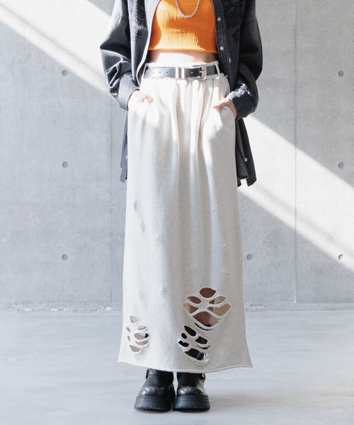 異なるダメージ加工をミックスさせたカットスカート 《POINT》 ・裾の辺りには大胆に施したダメージ加工、その上にはランダム風に小さなダメージ加工と ダメージ感のサイズをあえて変えたデザインとなっております。 ・裏毛素材なので適度なストレッチ性があり、ウエスト部分はオールゴムなのでストレスフリーな着心地です。 ・すっきりとしたナローシルエットで細見え効果も。 ・ポケット付きなのも嬉しいポイント。 ・ラフに着回せる、楽してお洒落が叶うモードカジュアルなスカートです。 〈注意事項〉 ※サンプルにて撮影をしておりますので、実際の商品とは仕様や加工・サイズ等が若干異なる場合がございます。 ※屋外の光や照明の当たり具合で、実物と色味が異なって見える場合がございます。詳細画像の色味をご確認ください。 なお、商品の色や質感を出来るだけ忠実に再現するよう心掛けておりますが、パソコンなどの環境により、実物と若干異なる場合がございます。 ※写真を許可無くコピー・転用することは固くお断りします。
