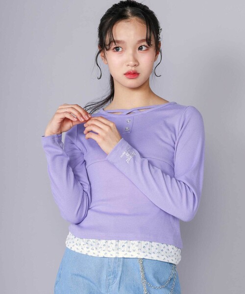 バレエの衣装のようなテーストをコーデに落とし込んだファッション、「バレエコア」。そんなバレエコアの要素をさりげなく取り入れたTシャツです。上品で可憐なイメージとデイリーに馴染むラフさを兼ね備えているのがポイント。目線が上に行く切り替えデザインがあって、スタイルアップ効果バツグン! 襟元のクロスデザインがすっごくオシャレで、フェイスボタンがアクセントになってい可愛い♪そのうえ、裾の切り替えがオシャレで、スカートにインしても、アウトしてもキマります。カラーはグレーとパープルの2色展開です。グレーは大人っぽくて落ち着いた雰囲気、パープルは神秘的で華やかな印象。素材はやわらかくて着心地抜群のコットン。春の陽気にぴったりで、一日中快適に過ごせちゃう♪これ一枚で、バレエコアな雰囲気が出せちゃうから、お友達にも自慢できちゃうね!あえてカジュアルなデニムと組み合わせクールなコーデも、デイリーに取りれやすいおすすめのスタイル。みんなも、このTシャツでかわいくキメてみない?【ZIDDY(ジディー)】~teen Lady~レディーストレンドを取り入れたクールでちょっぴり上品なスタイルを提案。ティーンズファッション