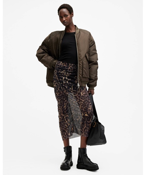 Nora スカートは一部リサイクルメッシュファブリックを使用したミディ丈シルエット。ギャザールーシュがアクセントの着映えするスリムフィット。クラシックアニマルプリント仕上げ。着心地のよいニットウェアとのスタイリングに最適。▼特徴、ポイントサイズ通りのボディコンフィットプルオーバーハイライズローエッジミディ丈リサイクルファブリックレオパードプリントボディコンフィットモデル寸法: 身長: 5'11"/180cm, バスト: 31.5"/80cm, ヒップ:35.5"/90cm, ウエスト: 23.5"/60cmモデルはUK 10サイズを着用しています。洗濯表示:裏返し洗いALLSAINTS(オールセインツ)について1994年創業の英国発プレミアムコンテンポラリーブランド。イーストロンドンに本社を構え、メンズ・ウィメンズウェアをはじめとする商品のデザインからストアデザインまで、すべてを自社でコントロールしています。アイコンのバイカージャケットを筆頭に、バッグやシューズなどのレザーグッズ、独特なシルエットのドレス、素材にこだわったニットやシャツ、デニムなどの豊富なアイテムが揃います。現在、世界26か国に250店舗以上を展開中。