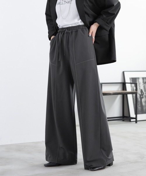 高見えするTR素材を使用◎ ステッチデザインでラフに見えすぎないワイドパンツ! ■おすすめの着こなし ☆こなれスタイルには・・・ 同生地を使用したTRシャツとのセットアップが今年らしい! 足元はあえてスニーカーで崩すと、ワンランク上のお洒落コーデが完成◎ ☆デイリースタイルには・・・ ルーズサイズのスウェットやTシャツと合わせた、ゆるスタイルも可愛い! 前だけタックインすれば、美脚効果も抜群! ーーー ■ポイント セットアップ対応のTRイージーパンツが登場! ステッチデザインが縦のラインを強調してくれるので、穿くだけでスタイルアップできます。 切り替え×ステッチでカジュアル感を残しつつ、今年らしい着こなしが叶うのも嬉しいポイント! ウエストゴム×紐仕様のイージーパンツなので、サイズ調節も可能◎ フィット感があり、窮屈さを感じないノンストレスな穿き心地です。 ゆったりとしたワイドストレートなシルエットが、トレンドライクな雰囲気を演出してくれます! ■素材 シワが付きにくく、きれい見えするTR素材を使用。 上品な質感で高見え。肌触りも良いのでデイリーユースしていただけます。 ーーー ▼同素材を使用したTRブルゾンとセットアップ着用可能です。 ・【<セットアップ対応>TRステッチルーズシャツ】 商品コード:91817154 ・【<セットアップ対応>TRステッチルーズシャツ】 商品コード:94991750