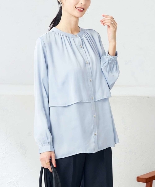 ◆きちんと感を備えたレイヤードスタイルが完成◆ 【デザイン】 ・一枚で完結するレイヤード風ブラウス ・前後2WAY仕様で雰囲気を変えた着こなしを楽しめます ・腰周りしっかりと覆う着丈 ・程よくきちんと感がありON/OFF兼用◎ ・ベーシックなダークグレー/アイボリー、爽やかなライトブルーの三色展開 ・同デザインで柄タイプもご用意しております 【同デザイン】 ◆幾何柄レイヤード風ブラウス:K2BFA35049 【素材】 ・さらっとしたなめらかな着心地 ・ご自宅の洗濯機で洗えます ・お手入れ簡単なイージーケア ・夏に嬉しい吸水速乾&UVカット機能 【コーディネート】 トップスインもアウトもしやすい幅広い着こなしを叶える一着。 カーディガンやジャケットなど羽織りやすく、お仕事スタイルにも活躍します。 -------------------- 透け感:なし 裏地:なし 伸縮性:ややあり 光沢感:ややあり 生地の厚さ:ふつう -------------------- ≪お気に入り登録機能の使い方≫ ■商品のお気に入り登録(ハートマークをクリック) 再入荷通知や値下げ等、お得なご案内を受けることができます。 -------------------- ※商品画像は、光の当たり具合やパソコンなどの閲覧環境により 実際の色味と異なって見える場合がございます。 商品の色味の目安は商品単体の画像をご参照ください。