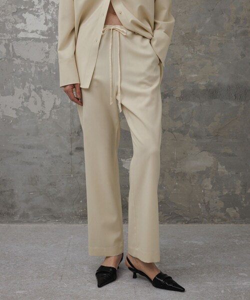 ◇2025春夏◇ ADAM ET ROPE' EMOELLE 【Material】 薄手で滑らかなサラッとした梳毛で、着用期間の長い素材感。 女性らしい程良い落ち感のある生地を厳選。 毛羽のないきれいな表面で品のある一着。 【Design】 やや細身のストレートシルエット、フルレングスのイージーパンツ。 ウェストはゴムなしのドローストリング使用で、ジャストウェストから腰履きまで、その日のスタイリングによって履き位置が調整可能。 締め付け感のない着心地も魅力。 ウエストコード先にはほんの少しクラフト感のあるディティールを取り入れて、ワンポイントに。 【Color】 モードなブラックと、フェミニンなライトベージュの2色展開。 【Styling Point】 腰丈のトップス合わせや、ジャケットなどがおすすめ。 きれいめでシンプルなイージーパンツなので、きっちりとジャケット合わせも、あえてスウェット等のカジュアル合わせも。 足元もキレイめのヒールからスニーカーやボリュームソールなど、幅広いテイストで合わせて。 --------------- 透け感:淡色はややあり 裏地:なし 伸縮性:なし 光沢感:なし 生地の厚さ:やや薄手 開き方:ウエストゴムなし、ドローコードあり ポケット:あり --------------- ◇モデル情報 身長:177cm size:38(ブラウンヘア) 身長:166cm size:38