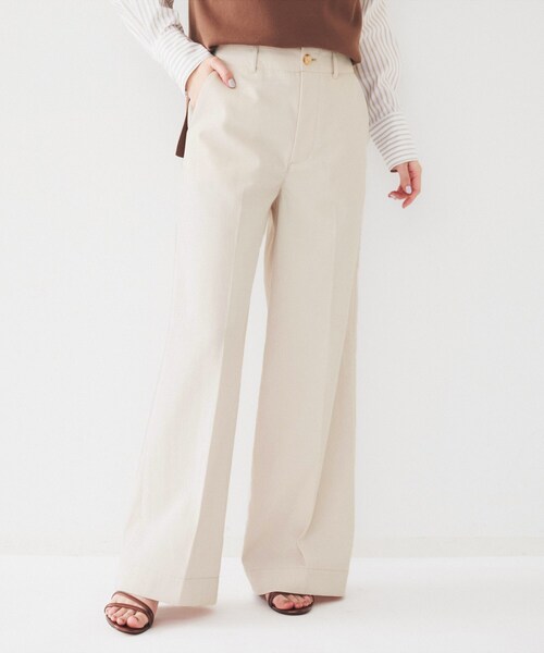 【デザイン】長めのレングス、ゆったりなシルエットが今の気分にぴったりなチノパンツ。メンズライクな要素は残しつつ、股上は浅くしすぎずミニマルなデザインと美しいシルエットが新しいトラディショナルを感じさせます。コットンチノとは異なる、合繊ならではのコンパクトでクリーンな質感もポイント。【素材感】限りなく綿ライクをポリエステルで表現した素材。リサイクルポリエステルのスパンMVS糸を使用する事でまるで綿のような天然感のある素材に仕上げているのが最大の特徴。毛羽立ちが少なく、リネンを少し加える事でより天然素材らしい表情に仕上げています。・ポケット数:横×2 後ろ×2・前ファスナー・裏地なし※ライトグレー(010)はやや透け感があります。※照明の関係により、実際よりも色味が違って見える場合があります。また、パソコン・スマートフォンなどの環境により、若干製品と画像のカラーが異なる場合もございます。モデル情報:身長166cm B80 W58 H83 着用サイズ:02(M)店舗へのお問い合わせ商品番号:153-62300●製品寸法:00(XS):W66cm H93cm 股下67cm 前股上28cm 渡り幅31cm 裾幅28cm01(S):W69cm H96cm 股下75cm 前股上28cm 渡り幅32cm 裾幅29cm02(M):W73cm H100cm 股下75cm 前股上29cm 渡り幅33cm 裾幅30cm03(L):W76cm H103cm 股下76cm 前股上29cm 渡り幅34cm 裾幅31cm04(2LT):W79cm H106cm 股下76cm 前股上30cm 渡り幅35cm 裾幅32cm42(2L):W83cm H110cm 股下75cm 前股上31cm 渡り幅37cm 裾幅33cm44(3L):W87cm H114cm 股下75cm 前股上31cm 渡り幅38cm 裾幅34cm46(4L):W91cm H118cm 股下75cm 前股上32cm 渡り幅39cm 裾幅34cm48(5L):W95cm H122cm 股下75cm 前股上33cm 渡り幅40cm 裾幅35cm50(6L):W99cm H126cm 股下75cm 前股上34cm 渡り幅42cm 裾幅35cm備考: