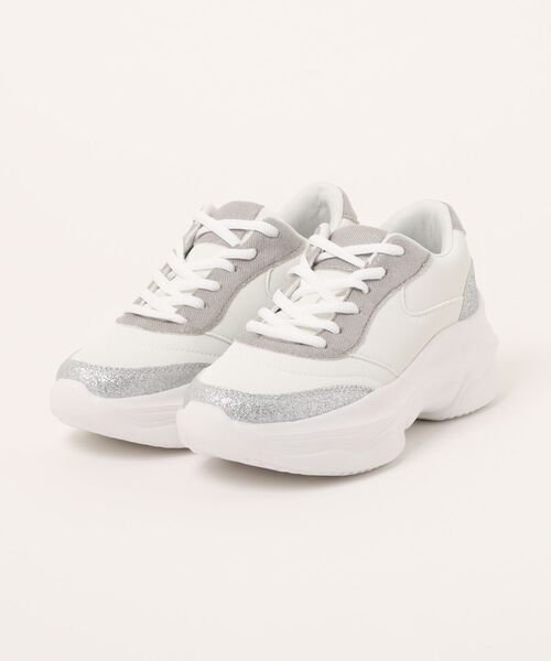 キラキラと輝くグリッター素材が目を引く、JEWEL CASKETの厚底スニーカー。 【商品説明】 スムース素材とのコンビネーションが、上品さとカジュアルさを両立。 レースアップデザインで、フィット感も抜群。 厚底ソールで、スタイルアップ効果も期待できます。 ブラック、ベージュ、ホワイトの3色展開で、オールシーズン着用できます。 ※WEB限定デザインです。 ※照明の関係により、実際よりもやや明るく見える場合がございます。またお手元のパソコンなどの環境により、製品と画像のカラーが若干異なる場合もございます。予めご了承ください。