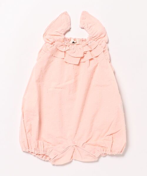 小さな水玉が可愛らしいドビーワッシャー素材のロンパース。首回りはゴム仕様なので、頭からすぽっと被れて、軽くて着せやすいデザインです。左裾のうさぎのmimiちゃんのシルエット刺繍がさりげなくアクセントになっています。お出かけ着やギフトにもおすすめのアイテムです。
