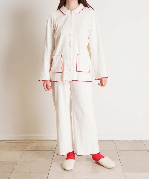 優しい雰囲気のコットン針抜き素材。 メロー始末のデザインが新鮮なナイトウェアシリーズ。 生地の間に空気を含んだ温かみのある新素材を使用。 綿100%ながらも、厚みのあるしっかりとした生地感。 配色のメローとロゴ釦がデザインポイント◎長袖パジャマは、シンプルな襟付きデザイン。 トップス・パンツともに脇接ぎ無しで縫い代が当たらない肌に優しい仕様。 袖口や裾、襟ぐりはメロー始末ですっきりと仕上げました。 パッと華やぐカラー展開で、おうち時間の気分を上げるのにもぴったりのアイテムです◎