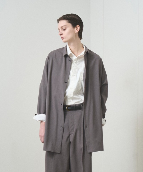 【TROVE SPRING SUMMER 2025】スーパー100原料 極細番手で織り上げたウールトロピカルクロス。軽く、サラッとした肌触りの春夏対応素材。両サイドにシームポケット配備、TROVE オリジナルボタン使用。ドルマンスリーブ、セミロング丈の緩やかなシルエット。※同素材の"73PAN01" "73PAN02"とセットアップで着用可能。ブランド品番:73SHT01