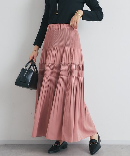 上品で鈍い光沢感がスタイリング映えする一枚 商品ポイント ・しなやかで落ち感ある素材にプリーツ加工を施したティアードスカート ・ウエストゴム仕様でストレスフリーな履き心地 ・ポリエステル素材特有の艶と落ち感があるデザイン おすすめスタイリングアイテム メッシュニットプルオーバー スウェットライクニットカーディガン ドロストシャーリングブラウス シルケット風シンプル5分袖Tシャツ 素材 ポリエステル100% 洗濯方法:手洗い可 透け感:なし 裏地:なし 伸縮性:あり 生地の厚さ:やや薄手 光沢:あり ポケット:なし ファスナー:なし スタッフ着用コメント 《RINO》 身長:148cm/着用サイズ:F 体型:普通/骨格:ストレート/パーソナルカラー :ブルベ冬 サイズ感:ウエストゴムでストレスフリーな履き心地 コーデポイント:コンパクトなトップスとの相性良し! 《まっしー》 身長:157cm/着用サイズ:F 体型:普通/骨格:ナチュラル/パーソナルカラー :イエベ秋 サイズ感:足首にかかる丈感 コーデポイント:広がらずすっきりと見えるプリーツデザイン。 ウエストまわりもすっきりと見えるので、ゆったりとしたトップスを合わせるときは、 前だけインして着るのもおすすめです! 骨格タイプ 骨格ストレート:全体的に立体型で筋肉質。ひざ下はすらっと細め。ボディラインにメリハリがある。 骨格ウェーブ:上半身が薄く、華奢。緩やかな曲線のボディライン。下半身に重心があり女性らしい体型。 骨格ナチュラル:筋肉や脂肪があまり感じられない体型。腰の位置が高く骨や関節が目立ちやすい。 -------------------------------------------------------------------------------- 【注意点】 ※画像の商品は光の照射や角度、お使いのモニター環境により、実物と色味が異なる場合がございます。 ※入荷状況により、お届け予定が前後する場合があります。 ※工場の生産の都合上、納期が変更になる場合がございます。検品や輸送の関係で、発送日が前後しますのでご了承ください。 また、入荷状況により、お客様への発送が店頭販売より遅れる場合もございます。 ※追加生産商品は、一部の店舗、通販で販売中の場合がございます。予めご了承下さい。 ※サンプルでの撮影、計測をしております。商品の仕様が一部変更になる場合がございます。 ※撮影サンプル品はブランドタグがついておりません。製品にはタグがつきますので、製品の表に縫い糸が見える場合がございます。 -------------------------------------------------------------------------------- 【お買い物をもっと便利に楽しく♪】 『♡』をクリックでお気に入り登録 ✓「商品のお気に入り登録」で・・・ ラスト1点や再入荷の通知が届きます。 登録して頂いた商品だけが対象となる、あなただけのタイムセールが開催されることも! ✓「ブランドのお気に入り登録」で・・・ 新商品や再入荷など、 いち早くブランドのお得な情報を受け取ることができますので、ご登録をおすすめします! --------------------------------------------------------------------------------