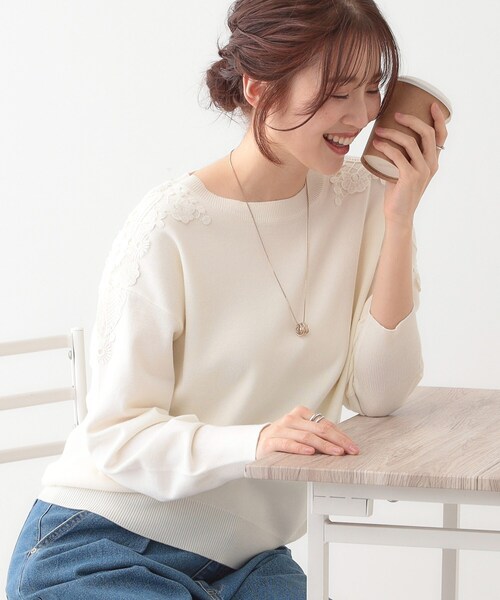 モチーフレースがアクセントのデザインニット 【デザイン】 肩部分にモチーフレースが施されたデザインニットです。 レースがポイントになり、お顔まわりを華やかにしてくれます。 シンプルなシルエットで、取り入れやすく何にでも合わせやすいのも嬉しいポイント。 【スタイリング】 スカートやパンツなどどんなボトムとも合わせていただけます。 フェミニンにフレアスカート合わせや、デニムに合わせて少しカジュアルに合わせるのもオススメです。 着丈が長すぎないので、インでもアウトでも着こなしが可能です。 【素材】 サラッとしたレーヨン混の素材を使用しています。 肩部分にはレースを使用しています。 ※照明の関係により、実際よりも色味が違って見える場合があります。また、パソコン・スマートフォンなどの環境により、若干製品と画像のカラーが異なる場合もございます。 モデル情報:身長168cm B82 W59 H85 着用サイズ:02(M) 店舗へのお問い合わせ商品番号:741-12040 ●製品寸法: 01(S):着丈57cm B94cm 袖丈47cm 肩幅46cm 02(M):着丈59cm B97cm 袖丈48cm 肩幅48cm 03(L):着丈61cm B100cm 袖丈49cm 肩幅50cm 04(LL):着丈63cm B104cm 袖丈50cm 肩幅52cm 備考: