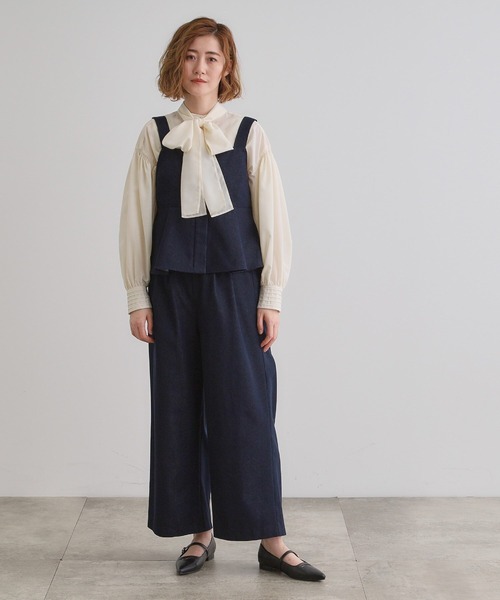 grove定番大人気!ツイードビスチェ&パンツSET UP 【デザイン】 昨秋から大人気完売のビスチェセットアップの春夏バージョンです。 トレンドのビスチェと同素材でお作りしたワイドパンツがセットになったお得なセットアップ企画。 ビスチェ単体だけでもトレンド感ある着こなしが楽しめますが、 セットアップで着用することでサロペット風の着こなしが楽しめるのがポイントです。 ビスチェとパンツのウエスト後ろ側にはゴムを寄せた仕様になっており、体型を選ばない楽な着用感です。 張り感の少ないツイード素材を使用しているので、 ワイドパンツのシルエットも横に広がらず、すっきり縦見えする美シルエットになっています。 ウエスト部分は敢えてベルト切り替えを入れないことで、厚みを軽減しリラックス感ある穿き心地を目指しました。 【素材】 縦横に走る節が麻見えするスラブ糸が入った表情ある素材を使用。 ツルッと見えしない表情ある表面感が高見えする1枚です。 (※012カラーは杢調になっています) デニム見えするシャンブレー生地とのアソート展開になっています。 【スタイリング】 春はブラウスやリブのインナーを合わせて大人上品スタイルに。 夏はTシャツやノースリーブニットと合わせてラフでカジュアルな着こなしも楽しめ、インナー次第で長く愛用頂けます。 それぞれ単品使いでも合わせ易く、汎用性の高いセットアイテムです。 【仕様】 ビスチェ ・一部裏地あり パンツ ・ポケット数:横×2 ・ウエスト後ろゴム ・裏地なし ※照明の関係により、実際よりも色味が違って見える場合があります。また、パソコン・スマートフォンなどの環境により、若干製品と画像のカラーが異なる場合もございます。 【25SS】 モデル情報:身長166cm B80 W59 H86 着用サイズ:02(M) 店舗へのお問い合わせ商品番号:768-52019 ●製品寸法: 01(S):ビスチェ着丈49cm ビスチェB85~96cm パンツW64~89cm パンツH103cm パンツ股下60cm パンツ前股上33cm パンツ渡り幅33cm パンツ裾幅27cm 02(M):ビスチェ着丈50cm ビスチェB88~99cm パンツW67~92cm パンツH106cm パンツ股下61cm パンツ前股上33cm パンツ渡り幅35cm パンツ裾幅28cm 03(L):ビスチェ着丈51cm ビスチェB91~103cm パンツW70~95cm パンツH109cm パンツ股下62cm パンツ前股上33cm パンツ渡り幅36cm パンツ裾幅29cm 04(LL):ビスチェ着丈52cm ビスチェB94~106cm パンツW73~98cm パンツH112cm パンツ股下63cm パンツ前股上34cm パンツ渡り幅37cm パンツ裾幅30cm 05(3L):ビスチェ着丈53cm ビスチェB97~110cm パンツW76~101cm パンツH115cm パンツ股下63cm パンツ前股上34cm パンツ渡り幅38cm パンツ裾幅30cm 備考: