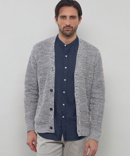 【着用推奨シーズン:春・夏】<素材>コットンに麻のような清涼感を持たせる特殊な糊付け加工(擬麻加工)を施した糸を3色引き揃えてメッシュ編みで編み上げました。今年は糸の太さを前年比60%程の太さに変更することで、より軽く、上品な見え方にアップデートしました。清涼感があり春先から初夏まで快適にご着用いただけます。<デザイン>レギュラーフィットの腰ポケット付きカーディガンです。ざっくりとした編地感の為、引っかけと自重による寸法変化にご注意の上、ご着用ください。