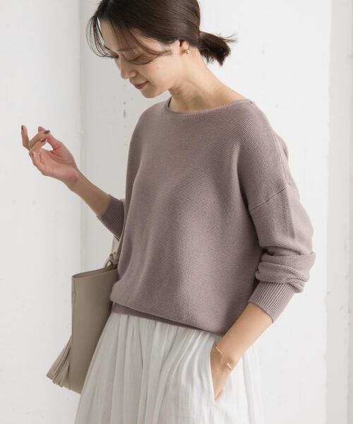 春先から着やすい柔らかな綿100%の糸を使用し、ニュアンスのあるガーター編みのニットをご用意しました。 首元はスッキリとした印象のボートネックで、ハイゲージながら凹凸のある表面が存在感たっぷり。 身頃には適度なゆとりもありながらコンパクトなサイズ感に仕上げているため、ボリュームのあるボトムスを合わせてもまとまりやすく、幅広いコーディネートに活躍します。 カラーも落ち着いた馴染みの良い3色をセレクトし、手持ちのアイテムにプラスするだけで雰囲気を作ってくれる一着です。 【2025 Spring/Summer】【25SS】 ※この商品は、毛抜けや毛羽寄りの生じやすい、デリケートな素材を使用しています。 ※硬い衣類との重ね着や長時間の連続使用はお避けください。 総重量 : 約325g ※商品画像は、光の当たり具合やパソコンなどの閲覧環境により、実際の色味と異なって見える場合がございます。予めご了承ください。 ※商品の色味の目安は、商品単体の画像をご参照ください。 ▼お気に入り登録のおすすめ▼ お気に入り登録商品は、マイページにて現在の価格情報や在庫状況の確認が可能です。 お買い物リストの管理に是非ご利用下さい。 素材感 透け感 : なし 伸縮性 : ややあり 裏地 : なし 光沢 : なし ポケット : なし M