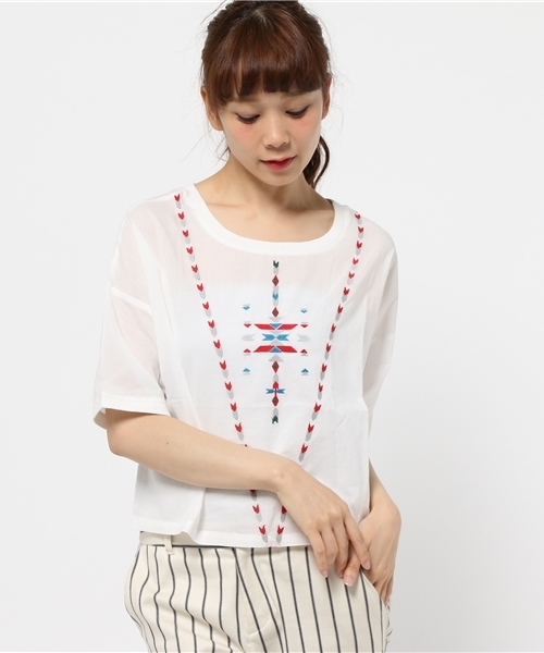 【Ciaopanic】 綿ボイル刺繍T エスニックな刺繍を施した半袖Tシャツです。さらっと軽い綿ボイルで着心地のよさにもこだわりました。ゆったりとしたワイドシルエットは、5分袖とショート丈で今季らしいバランスに。ミモレスカートやガウチョとも相性がいいので、トレンドアイテムとして活躍してくれます。