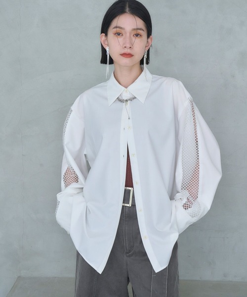 ーーー 袖のメッシュがポイントのチュニック丈シャツ ーーー point □お尻まで隠れるチュニック丈で体型カバーが叶うデザイン □袖はメッシュの切り替えで、程よい肌見せができる □ポリレーヨン素材で綺麗めに着用できる styling ビスチェと合わせたり、ベルトやハーネスでウエストマークするとすっきりとした印象で着用いただけます。 一枚着はもちろん、羽織りとしての着用もおすすめです。 ※撮影環境により、光の当たり具合で 色味が違って見える場合があります。 あらかじめご了承下さい。