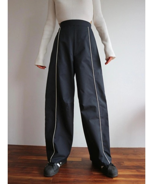【Item Comment】トレンドのトラックパンツ風デザインをカーブシルエットにアレンジしたこなれ感の高い1本。センターラインのパイピングがスポーティなアクセントになり、縦のラインを強調するので脚長見え。程よいストレッチ感と張り感のある素材で、カジュアルな中にきちんと感もプラス。ゆったりとしたシルエットで脚のラインが響きにくく、軽量なので1日中穿いてもストレスフリーな履き心地です。サイドポケット付きで、ウエストはバックのゴムで伸縮するので窮屈感もなく前はフラットなベルトラインでトップスインもすっきり決まります。合わせやすい濃紺ネイビーと、華やかなアイボリーの2色展開。【Coordinate】ジャージパンツのようなバイカラーのラインがシンプルなコーデにもアクセントをプラスしてくれます。ぴったりしたトップスをINして合わせるコーデはもちろん、あえてゆるいトップスを合わせたトレンド感のあるルーズな着こなしもおすすめです。【Color Variation】NAVY/IVORY※着用画像は実際の商品とお色味が多少異なる場合がございます。【Material】裏地:□あり ■なし厚み:□薄手 ■普通 □厚手透け感:□あり ■なし伸縮性:■あり □なし光沢感:□あり ■なし洗濯方法:手洗い可能【Model】Director(佐野真依子):162cm【 “お気に入り登録”でお買いものが便利に! 】▼商品のお気に入り登録完売カラーの再入荷時や、ラスト1点の時、セール開始時にお知らせします。▼ブランドのお気に入り登録新商品や再入荷、セール情報など、いち早くTRUNC88のお得な情報を受け取ることができます。ぜひご活用ください。※ご注文いただいた予約商品のお届け時期の確認は、注文履歴ページより行えます。