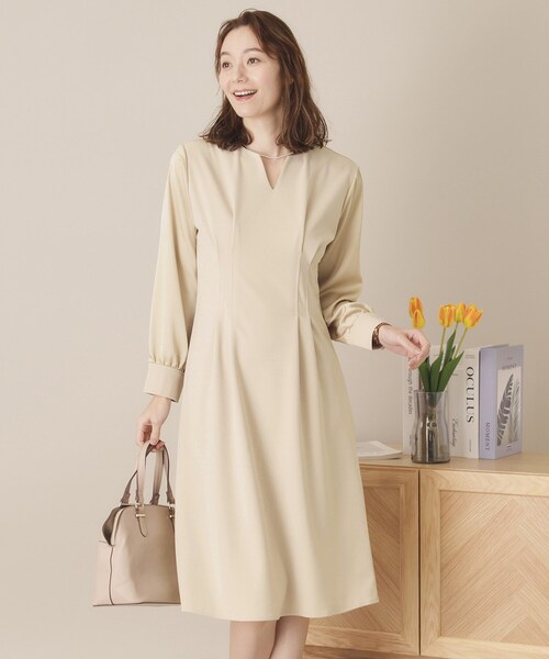 【デザイン】 オケージョンシーンで活躍する、一枚できちんと見えの優秀ワンピース。 カットジョーゼット素材を使用した伸縮性のある着心地が魅力のワンピース。 袖は上品な光沢のサテン素材を使用し華やかさを演出。 フロントにタックを入れたすっきりラインで簡単に美シルエットが決まります。 デコルテラインを綺麗に魅せてくれ、首元のネックレスが映えるキーネックデザインもポイントです。 【素材】 伸縮性のあるカットジョーゼット素材。 【仕様】 ・ポケットなし ・裏地なし ※こちらの商品はやや透け感があるため、インナーの着用をおすすめします。 ※照明の関係により、実際よりも色味が違って見える場合があります。また、パソコン・スマートフォンなどの環境により、若干製品と画像のカラーが異なる場合もございます。 モデル情報:身長171cm B80 W59 H88 着用サイズ:00(フリーサイズ) 店舗へのお問い合わせ商品番号:P93-52007 ●製品寸法: 00(フリーサイズ):着丈107cm B88cm 袖丈55cm 肩幅39cm W78cm H90cm 備考: