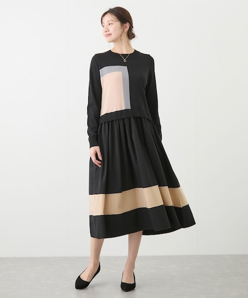 【デザイン・シルエット】 ニットと布帛のドッキングワンピース。 落ち着いた配色がポイントに。 スカート部分はフレアシルエットで、女性らしい着こなしが叶います。 一枚で華やかに仕上がるアイテムです。 【素材感】 ドライタッチなニットとハリのある布帛のドッキング 【カラー】 01クロ 27ベージュ 45ブルー 【スタイリングポイント】 ニット部分に透け感があるのでインナー必須です。 さらっと一枚で◎ 春先はジャケットやロングコートなどバリエーション豊かにコーディネートしていただけます。 裏地:なし 光沢感:なし 透け感:ニット部分あり ポケット:あり 伸縮性:あり 生地の厚さ:普通 ボタン:なし その他仕様:なし 季節:春秋 ※撮影時の光、お使いのモニター環境によって色の見え方が違う場合がございます。予めご了承ください。 モデル身長:172cm 着用サイズ:F