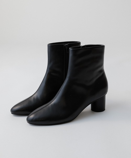 【Design & Styling】シャープな印象のスクエアトゥがトレンド感のあるショートブーツ。アッパーをスリムなシルエットにし、スタイリッシュなデザインに仕上げました。変形デザインがアクセントになった太めの6cmヒールは、疲れにくく歩きやすい安定感のあるデザイン。合皮素材でお手入れもしやすく、毎日のコーディネートに取り入れやすいアイテムです。