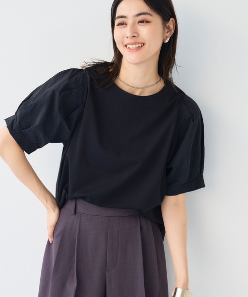 1枚でサマ見え、快適機能の袖布帛切替プルオーバー ■エブ楽とは? Everyday 「楽」に着れるシリーズ。 365日毎日着たくなるような、着心地もお手入れも楽ちんな味方服。 《嬉しい2つの機能》 1. 接触冷感 ひんやりタッチの接触冷感で夏場も快適に。 2.汗染み防止 暑い季節でも汗が染み込まず快適に過ごせる、夏場の強い味方! 【デザイン】 ・トレンドの華やか異素材袖タックディティールがポイント! ・ボリュームスリーブが二の腕をカバーしつつ、華やかな印象をプラス。 ・首元を華奢にすっきり見せてくれる程よいクルーネック。 ・さらっと1枚着るだけで、パッと華やかに見せてくれます。 【コーディネート】 ・しっかり映えるデザインなので、これ一枚でスタイリング完成! ・スラックスやボトムと合わせたカジュアルなコーデはもちろん、 スカートやキャミワンピと合わせればフェミニンな印象に。 ・肌離れの良い裾で広がるナチュラルAラインは、インしてもアウトしてもかわいい丈感。 【サイズ展開】 M L LL モデル身長:165cm/168cm 着用サイズ:Mサイズ 【洗濯・取り扱い】 洗濯:洗濯可能 アイロン:アイロン可(スチームアイロン不可) 乾燥:タンブル乾燥不可 ------------------------------------- 透け感:なし 伸縮性:あり(布帛部分はなし) 厚み:普通 -------------------------------------- ※撮影時のライティング、ご覧になっているモニター・PC環境により実際の商品と色味が異なって見える場合がございます。ご了承の上お買い求め下さい。