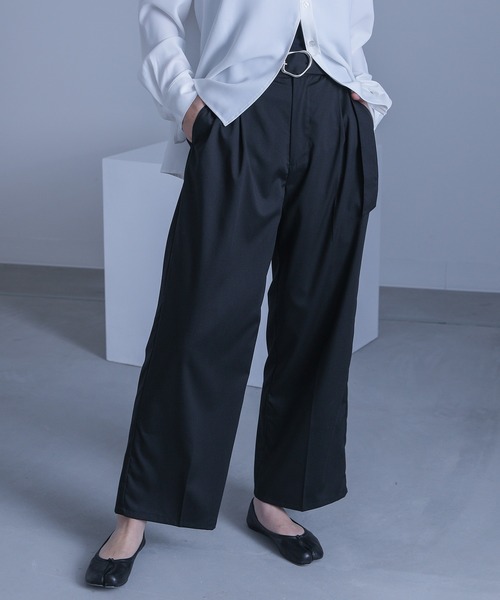 ■デザイン 大きめの変形バックル付きベルトがポイントになったワイドパンツ。ストレートなシルエットと前側に入ったタックですっきり見え、穿くだけで綺麗めな雰囲気を演出できます。 ■コーディネート トップスをインすることで、変形バックルをポイントにした印象的なスタイリングに。 トップスをインしないスタイリングの場合は、シャツのボタンを開けてバックルをチラ見せすると、こなれ感のある印象が作り出せます。 デザインシャツと合わせることでモードな印象が際立ち、同系統のスーツ生地のジャケットと合わせることでオケージョンにも合うコーディネートが完成します。 足元はパンプスやローファーと合わせてクールに決めたり、スニーカーでカジュアルダウンさせたスタイリングもオススメです。 ■素材 さらりとした肌触りで上品な印象のスーツ生地。 滑りの良い裏地付きで、コーディネート次第でロングシーズンご着用いただけます。
