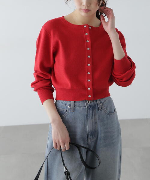 〔fabric&design〕 春先からの時期に適したコットン混の総針編みのカーディガン。 コンパクトながら襟ぐりやバストはややゆとりを持たせ、羽織った際に窮屈にならないようにしています。 フロントには半透明のドットボタンを間隔狭く羅列し、デザインポイントにしました。 さっと羽織れるカーディガンの需要が多くなる春夏にピッタリのアイテムです。 〔styling〕 キャミワンピースやジャンパースカートの上からはもちろん、肌寒い時にはカットソーやブラウスの上にさっと羽織るのがおススメです。 ■透け感:なし ■生地の厚さ:普通 ■裏地:なし ■伸縮性:あり ■光沢:なし ■シルエット:スタンダード --------------------------------------------------- ◆商品のお気に入り登録◆ お気に入りアイテムの値下げ・再入荷・在庫1点などの通知を受け取ることができます。 ◆ブランドのお気に入り登録◆ 新商品や再入荷、セール、クーポン配布などお得な情報を受け取ることができます。 ---------------------------------------------------