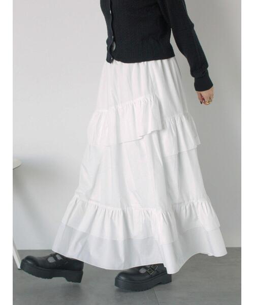 アシンメトリーなフリルがモードな印象を演出するティアードスカート。 フレアに広がるシルエットでスタイリングも華やかな印象に◎ ウエストは総ゴムギャザー仕様になっていて安心感のある穿き心地です。 キレイめブラウスはもちろん、あえてスポーティなパーカーと合わせたりと様々な着こなしも楽しむことができます。 ※商品画像は、撮影環境やお客様のご利用のPC・スマートフォンのモニター環境などにより実物と色味に差異がある場合がございます。 【その他採寸】 F ウエスト:[ゴム仕様]64cm