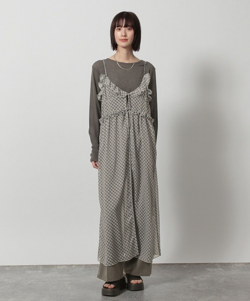 総柄チェックがスタイリングの主役になるキャミワンピース。透け感のあるシアー素材で下に合わせるアイテムとのレイヤードを楽しめる1枚です。フロントは2段リボンで締め付け感もなく、フリルデザインもアクセントに〇【素材】落ち感のある柔らかなシアー素材。【スタイリング】シンプルスタイルに合わせるだけでスタイリングを華やかにしてくれ〇レイヤードアイテムとして活躍します。