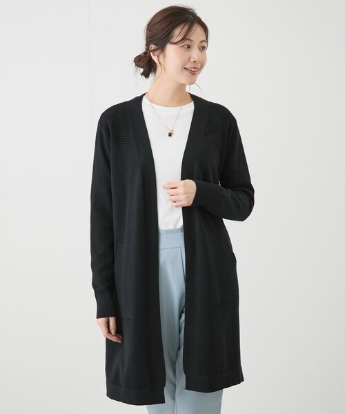 【デザイン・シルエット】 さらっと羽織れてデイリーに使いやすいカーディガン。 ロング丈で体型カバーもバッチリです。 ポケット付きなのも嬉しいポイント。 ところどころにリブの切り替えがあり、アクセントに。 【素材感】 滑らかなニット素材 【カラー】 01クロ 07グレー 27ベージュ 33ライトグリーン 40コン 63ピンク 80イエロー 【スタイリングポイント】 様々なスタイリングに羽織っていただけます。 細身のボトムやワンピースに合わせるのがスッキリと見えておすすめ。 カラバリ豊富でお気に入りの一枚がきっと見つかります! 裏地:なし 光沢感:なし 透け感:なし ポケット:あり 伸縮性:あり 生地の厚さ:普通 ボタン:なし その他仕様:なし 季節:春秋冬 ※撮影時の光、お使いのモニター環境によって色の見え方が違う場合がございます。予めご了承ください。 モデル身長:172cm 着用サイズ:F
