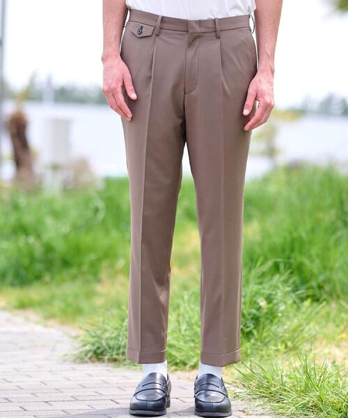 《リラックスシルエットでカジュアルにも着こなせる!メリノウールブレンドの良質機能素材》●美脚効果を感じられるワンタックセミワイドテーパード●2WAYストレッチでしわになりにくい機能素材●独自設計の立体的な腰まわり●オーバーラッププリント素材で裏仕様にもこだわり●スーツ工場で作った丁寧な縫製●セットアップでも単品パンツでも対応可能●こだわりシルエットにこだわったセミワイドテーパード。太すぎず細すぎず美脚効果を感じていただけるパターン設計をしています。フロントタックとバックスタイルのダーツ、立体的な腰まわりによってウエストへのフィットを向上。片側のヒップポケットに釦留めを加えることで中の物が落ちにくい設計で機能面もプラスしています。フロントには釦つきのコインポケットを配置。貴重品などを収納できそうです。●素材良質感を持つメリノウールにポリエステル、レーヨンなどを組み合わせ、独自のレシピで織り上げたトロピカル素材。縦横どちらにも伸縮する2WAYストレッチで着用時の動きやすさを感じていただけます。シワになりにくい素材なので、一般的なウールスラックスよりも扱いしやすくなっています。深みのあるブラックとインポートファブリックを思わせるブラウンベージュで染めた上品さのある色味もポイント。エレガントな空気は残しながら、リラックス感をプラスした今着たいシルエット。ジャケットとのセットアップだけではなく、単品パンツとしても重宝していただける一本です。こちらの商品にはセットアップのジャケットがございます。品番:086-42005【仕様】・ポケット数:横×2 後ろ×2・前ファスナー・前側のみ裏地あり※照明の関係により、実際よりも色味が違って見える場合があります。また、パソコン・スマートフォンなどの環境により、若干製品と画像のカラーが異なる場合もございます。店舗へのお問い合わせ商品番号:086-72405●製品寸法:76(Sサイズ):W84cm H109cm 股下69cm 前股上26cm 渡り幅35cm 裾幅19cm79(Mサイズ):W87cm H112cm 股下69cm 前股上26cm 渡り幅35cm 裾幅19cm82(Lサイズ):W90cm H115cm 股下70cm 前股上27cm 渡り幅36cm 裾幅20cm85(XL):W93cm H117cm 股下71cm 前股上27cm 渡り幅37cm 裾幅20cm備考: