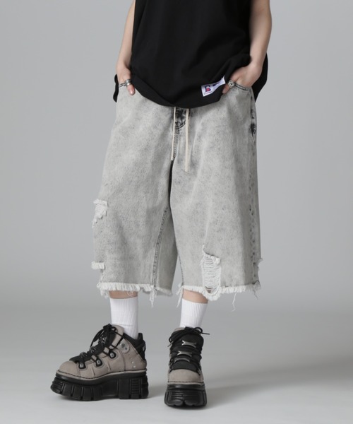 DankeSchon ダメージや色落ちが絶妙なデニムショーツ。 ワイドシルエットにする事でカジュアルだけでなくストリートやスケータースタイルにもお勧めです。 ウエストにはダストカラーのドローストリングスを配置。 垂らす事でアクセントとなり雰囲気抜群です。 スニーカー、ブーツ、サンダルと足元を選ばない万能アイテムです。 DankeSchon・・・DankeSchonとは、このブランドの核となるキーワード D digitaliyデジタル式 A Architect創造者 N neologism新表現 K kittenish悪ふざけ E engrossing心を奪う の頭文字を組み合わせたものにドイツ語のSchonを付け、ブランドの意図に賛同してくれる人達に感謝の意味を込め、「DankeSchon(ありがとうの意味)」としている。 ファッションのテーマは「ニュースタンダード」。時代に抗うのではなく、すり抜け受け流すことでブランドに見合う要素を抽出し、高品質な素材と、デジタライズなグラフィックを掛け合わせコレクションに落としていく。 純粋なシルエット、ディテールへの徹底したこだわりと同時に、ユニークで新しい見解も積極的に取り入れる。 そこから生み出された製品は、実用的でごく自然に日常に馴染むもの。