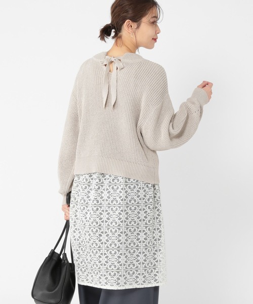 後ろリボンで大人フェミニンな着こなしに 幅広いコーデが楽しめるニットプルオーバー×インナーチュニックのセットアイテム ーーー 【素材】 ニットは滑らかな肌触りが特徴の微起毛モールを使用。 インナーチュニックは上部には着心地の良いカットソー生地、スカート部分にはレース生地を使用しています。 【デザイン】 トレンドコーデが簡単に完成するニット×インナーチュニックのセット。 ニットはざっくりとした編地が特徴で、後ろの首元のリボンがポイントです。 インナーチュニックは腰にレーススカートを巻いたような都連削コーデに。 セットではもちろん、それぞれ単体でも着用可能なので、幅広いコーデをお楽しみいただけます。 ーーー 【スタイリング】 セットで着用することで、簡単にトレンド感のあるコーデが完成。 それぞれ単品でお使いいただけるので、お手持ちのアイテムと合わせた着こなしもお楽しみください。
