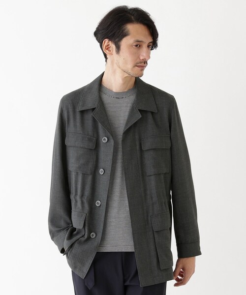 通気性の良いメッシュのサマーウールで仕立てた上品サファリジャケット 【デザインポイント】 狩猟や旅行の際に着用する機能性を重視して考案されたシャツ型のジャケットであるサファリジャケットを、サマーウールファブリックで上品に現代らしく仕立て上げたジャケットです。 特殊なメッシュ組織で織り上げているので、等間隔に小さい隙間(メッシュ)があり、通気性に富んでいます。 夏場を迎えるにあたり汗によるムラ、風通しを良くすることで快適に着用できます。 また、ウールにポリエステルを交撚しているので、ウール100%の織物に比べてシワになりにくく保形性があるのが特徴です。 平折衿の開衿仕立て、ウエストのアジャストベルト、プリーツ付きポケット、運動量を補う背中のプリーツは、サファリジャケットならではの特徴的デザイン。 フロントの比翼仕立てや釦を廃したアウトポケット、フレンチ仕様をリファレンスにしたウエストのアジャストベルトで、上品且つ軽量なサファリジャケットに仕立て上げています。 サファリジャケットは王侯貴族が愛用していたとされる歴史的背景から受けるラグジュアリーな印象も特徴的なアイテム。 ウエストコードを絞って着流す着こなしが旬を感じさせるおすすめスタイリングです。 【仕様】 ・ポケット数:胸元×2 横×2 ・裏地なし 【THE FLAGSHIP】 TAKEO KIKUCHIのアイデンティティや、アーカイブを掘り下げ、さらに今の時代感も取り込んだ、ブランドを象徴するレーベル。 厳選した国内の素材を使用し、日本でも最高峰の技術を誇る工場で縫製した品質の良さは、ブランドのコンセプトである『THIS IS THE JAPAN BRAND』を体現している。 ※照明の関係により、実際よりも色味が違って見える場合があります。また、パソコン・スマートフォンなどの環境により、若干製品と画像のカラーが異なる場合もございます。 モデル情報:身長186cm B88 W73 H92 着用サイズ:03(L) 店舗へのお問い合わせ商品番号:931-52101 ●製品寸法: 02(M):着丈76cm B117cm 袖丈61cm 肩幅45cm 03(L):着丈78cm B120cm 袖丈63cm 肩幅46cm 04(LL):着丈80cm B124cm 袖丈64cm 肩幅47cm 備考:重量:約440g(サンプルサイズ)