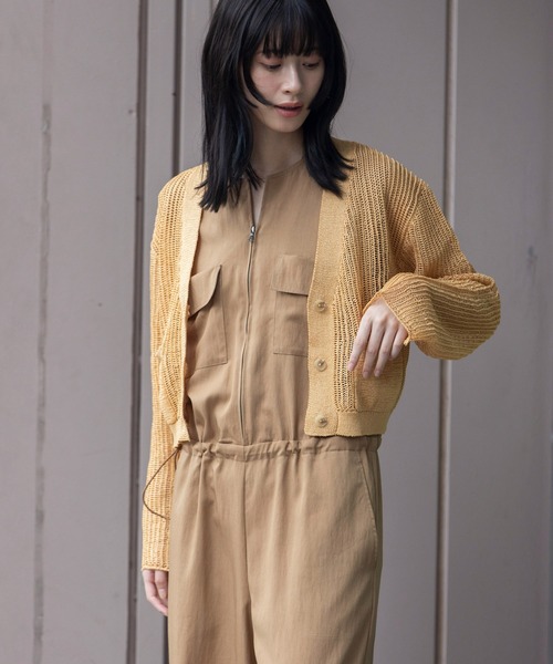 □ Munich 2025 spring & summer Collection □ ◆清涼感のある7ゲージ天竺針抜き編みニットのレイヤードスタイルにピッタリなカーディガン◆<MATERIAL>ポリエステル100%のテープヤーンです。ポリエステル成分の原料を特殊な技術で接着処理し、糸の形状をテープ状にする事で、リネン見えする風合いを表現しています。リネンの様なカラっとした質感を持ち合わせつつ、リネンの弱点でもある飛び込みや、水洗いで変形することもないので、真夏まで気を使わずに着用出来るのが特徴です。7GGの天竺針抜き編みで、編み目を開く様にきっちりセットする事で、メッシュの編みの様なスカッとした編地に仕上げています。ミドルゲージでありながら軽く仕上がり、トレンドの透け感も楽しめます。<DESIGN>スカッとした特徴的な編地で、シンプルに編地の雰囲気を楽しめる大人なニットカーディガンです。トレンドのショート丈に仕上げていますが、袖口はリブを付けずに、ずるんと長めにする事でバランスの取れたシルエットに仕上げ、子供っぽくならないサイジングに。ポケットは天竺編みで透け感を出さず、メリハリを加えています。さらっと羽織ったり、ボタンを留めてプルオーバーの様に着こなしたり、ボトムを選ばずスッキリとしたスタイリングが叶います。ぱっきりと明るい色展開なので、肩にかけたり、撒いたりしても、スタイリングのポイントとなりそうです。<COLOR>■グレイッシュベージュ:黄味のバランスがとれたほんのりグレイッシュな明るめベージュ■ネイビー:光の加減で黒見えする深みのある濃紺■グリーン:発色が美しい春夏らしいビビットなグリーン■イエロー:山吹色のような少しトーンを抑えた合わせやすいイエロー※光のあたり具合いやパソコンなどのモニター環境によって実際の色味と異なって見える場合がございますので、予めご了承ください。※着用商品はサンプルです。サイズ等の仕様に若干の変更がある場合がございますので、予めご了承ください。※お取扱いについては、商品についております品質表示、アテンションタグにてご確認ください。洗濯:手洗い可.............................≪INFORMATION ≫............................▼商品のお気に入り登録▼『♡』マークを押してお気に入り登録して頂いた商品は、セール開催の通知やクーポン発行などのキャンペーンなど、お得な情報をいち早く受けとる事が出来ますので、ぜひご登録ください。