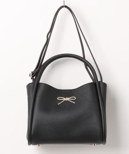 立体的なメタルリボンがポイントのバッグ。小ぶりながらも、中は仕切られているので整理整頓しやすいデザインです。肩掛けできるショルダーは取り外し可能。底びょう付きで汚れがつきにくい仕様に。大人フェミニンなキレイめコーデ、大人カジュアルスタイルにも相性バツグンです。※モデルの着用画像の場合、光の当たり具合により、実際の色味と異なって見えることがございます。色味は、商品単体の画像をご参照ください。