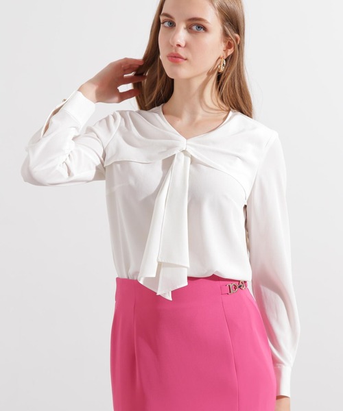 ボリュームのあるタイネックが新しいモダンなボウブラウスタイプ フロントにスカーフのように結んだデザインで、動きに合わせて揺れ動く軽やかなブラウス。 ボディのシルエットはコンパクトなのでジャケットのインナーとしても使いやすいサイズ感です。 【素材説明】 トリアセテートとストレッチ性のあるポリエステルを合わせる事で、シルクの様なふくらみと風合いを持たせた素材です。イージーケアでしわにもなりにくく、光沢感が非常に上品な素材です。 【商品特性】 かぶって着用/ストレッチあり/裏地なし ◆お買い物をよりお楽しみいただくために◆ ・「商品のお気に入り登録」で完売カラーの再入荷やラスト1点、セール通知を受け取ことができます。 ・「ブランドのお気に入り登録」で新商品の入荷情報など、いち早く受け取ることができます。
