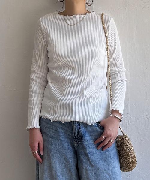 立体感のある三角テレコ生地が特徴のロンT。ベーシックなシルエットながら、配色のメローフリルがアクセントに!インナーとしても一枚着としても活躍する万能アイテムです。【素材】凹凸感のしっかりある三角テレコカットソー。【デザイン】襟メローフリル、ベーシックインナーロンT。【ポイント】ほどよい肉感のある三角テレコを使用しているので、インナー使いだけでなく一枚でも着られるもの好評ポイント。今年はメロー部分を配色使いにしています。[洗濯方法]洗濯の際はネットを使用してください[クリーニング]洗濯機洗い可(非常に弱く)、ドライクリーニング可(F)、ウェットクリーニング(W)