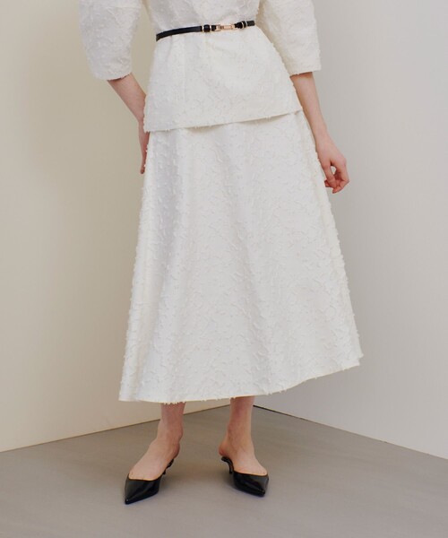 【allureville 2025 spring&summer】フランスのテキスタイルメーカーDUTELデュテル社の華やかなジャガード素材。表面の質感がポイント.生地の存在感があるので、上品なフレアスカートに落とし込みました。硬めの素材で仕上げているので、モードなフレア感が出るシルエットです。同素材のブラウス(202510-13-100)とのセットアップやシャツ合わせのスタイルがお勧めです。【スタッフコメント】ジャガード素材が華やかなフレアスカート。固めの生地で波打つ様なキレイなラインになってます。足首が少し見える丈感なので、すっきりと抜け感も。オケージョンにはもちろん、カジュアルなアイテム合わせも可愛く、シーンを問わず活躍するスカートです。※手洗い可能です。※照明の関係により、実際よりも色味が違って見える場合がございます。またパソコン・スマートフォンなどの環境により、製品と画像のカラーが異なる場合もございます。予めご了承ください。