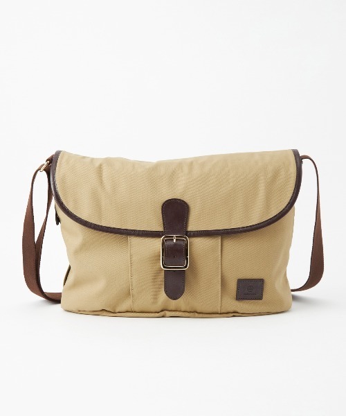 FLAP SHOULDER BAG BRITISH TWILL 自転車移動などに便利なフラップ付きショルダーバッグ。 定番のブラック×ブラックレザーと、クラシカルな配色のベージュ×ブラウンレザーでの展開。裏地にはGLENROYALのBOTTLE GREENを連想させるカラーをチョイス。13inch程度のラップトップが入る大きさで、ブライドルレザーをフラップパイピングに使用した贅沢で高級感のある逸品。フラップを開けずに中身が取り出せるファスナー口と、肩が痛くなりにくいよう、太めのショルダーテープを採用するなど、機能面もプラス。ポケットも充実しておりフロント×3とPCが収納できる内ポケットを付けています。容量も充分で、かつ軽量なため、タウンユースからレジャーなど幅広くお使いいただけます。 ブリティッシュツイルは撥水のツイル素材で、イギリス軍のベイカーパンツ生地を再現しています。撥水加工を施し軽量なブリティッシュツイルは、様々なシーンに適した万能な素材です。