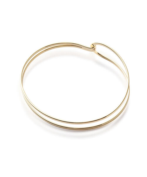 シンプルで洗練されたゴールドカラーのプレーンバングルです。手元にプラスワンするだけで女性らしいアクセントになります。バングルタイプながら、留め具に引っ掛けてお使いいただける仕様。コーディネートを選ばず合わせやすいデザインも嬉しいポイントです。※モデルの着用画像の場合、光の当たり具合により、実際の色味と異なって見えることがございます。