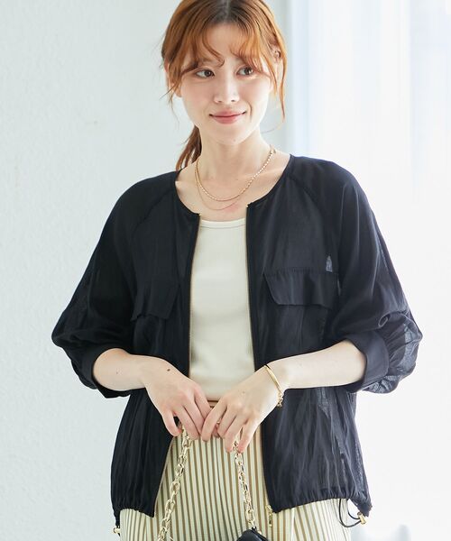 コンパクトなショート丈と分量感のある袖が女性らしいシアーブルゾン。 ブルゾンというカジュアルなアイテムをシアー素材で仕上げることで、女性らしくもあり、トレンド感もあるアイテムに仕上げました。 空気の流れを使って染める「気流染め」の加工を施しており、シワになりにくく、ご自宅でもケアしやすい生地を使用。 ●ポイント フロントは金属ファスナーで辛さをプラスし、大きめのポケットディテールがデザインポイントです。 袖口はすっきり止まるよう後ろ袖口にゴムを使用。 ウエストはドロスト仕様になっており、分量感を調整できるのも魅力。 ●おすすめコーデ パンツやスカートへの合わせやすさはもちろん、ワンピースに合わせても好バランス。 合わせるインナーで様々な雰囲気を楽しめるので、ロゴTシャツの上から合わせたり、キャミソールやタンクトップに合わせたりと、季節に合わせてぜひお楽しみください! ※取り扱いについては、商品についている洗濯表示にてご確認下さい。 ※照明の関係により、実際よりも色味が違って見える場合がありますまたパソコン・スマートフォンなどの環境により、若干製品と画像のカラーが異なる場合もございます。 ※商品の色味は、商品アップ画像をご参照ください。 【注意事項】 ・画像の商品はサンプルです。 ・サイズ表記はあくまで目安となります。 実際の商品と仕様、加工が若干異なる場合があります。