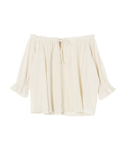 インドメイドのコットンオフショルブラウス。織りのあまい楊柳ガーゼ生地に施した微配色の刺繍は甘過ぎず、ブラウスが苦手な方も取り入れやすい1枚です。
