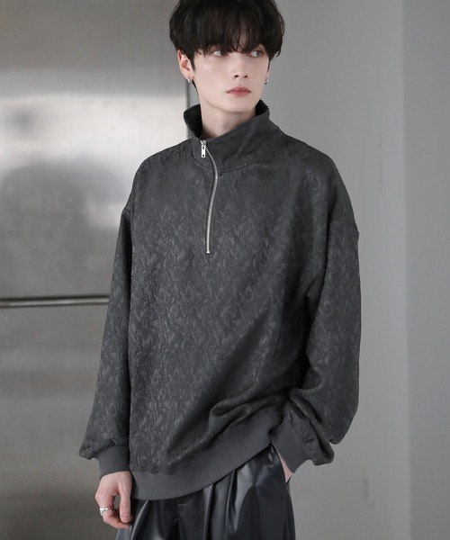 ■アイテム説明 総柄ジャガードが目を惹くハーフジッププルオーバー。 やや光沢感のある生地が、上品な雰囲気の中に程よい抜け感をプラスします。 ゆとりのあるサイジングとドロップショルダーがリラックス感のあるシルエットを演出し、こなれた印象に。 ジップの開け閉めによってレイヤードスタイルやハイネック仕様など、2wayでの着こなしが楽しめるのも嬉しいポイントです。 シンプルな無地(チャコール、ブラック、ホワイト)と、袖サイドライン入り(グレー系、ブラック系、ホワイト系)の2パターンをご用意しました。 モノトーンの落ち着いた雰囲気と、総柄ジャガードのトレンド感をMIXしたおすすめのプルオーバーです。 ■素材 ポリエステル100%の軽やかなジャガード生地を使用。 浮かび上がるような立体感のあるジャガード柄が華やかな印象をプラスします。 程よい光沢感があり、上品な印象で着こなせるアイテムです。 ※繊細な生地を使用している為、アクセサリーやバッグの金具部分などの引っ掛かりにお気を付けください。 ■コーディネート 落ち着いた単色カラーながら、総柄ジャガードがアクセントになり、コーデの主役として活躍する一着。 カジュアルさと上品さを併せもった一着で、キレイめなスラックス、カジュアルなカーゴパンツ、デニムなど幅広いジャンルと相性抜群です。 ▼商品詳細 透け感:なし 裏地:なし 光沢:ややあり 伸縮性:なし ※商品画像は、光の当たり具合やパソコンなどの閲覧環境により、実際の色味と異なって見える場合がございます。予めご了承ください。 【お買い物をお楽しみいただく為に】 ▼商品のお気に入り登録 完売カラーの再入荷通知や、ラスト1点の通知、セールの通知も受けることができます。 ▼ブランドのお気に入り登録 新商品や再入荷等、いち早くブランドのお得な情報を受け取ることができます。