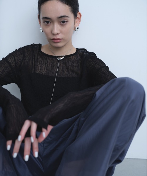 ー ディテール ーナチュラルな透け感の繊細なウェーブ模様のレース生地が甘さをおさえたセンシュアルな雰囲気に。タイトすぎないサイジングも着用しやすく、長めの袖丈+サムホールがポイント。着回ししやすいBLACKとOFFWHITE,ニュアンスカラーのDARK PURPLEをご用意。【色味に関しての注意事項】商品画像は、ストロボなど撮影機器の使用や光の当たり具合、お使いのスマートフォンやパソコンなどの閲覧環境により、実際の色味と異なって見える場合がございます。予めご了承ください。【SNS動画掲載アイテム】@aic_official上記の公式インスタグラムアカウントにて着回し動画を掲載しております。是非ご覧くださいませ。★お取り扱い注意事項★下記をご確認いただきご了承の上、ご購入ください。・こちらの商品はデザインを重視したデリケートな素材を使用しているため、引っ掛かりなどで糸がつりやすくなっております。・着用中の摩擦などにより、ピリング(毛玉)が生じる場合があります。・洗濯の際は色落ちしますので単独で洗い、湿気を含んだ状態や水につけたままで放置しないでください。・濃色の製品は、摩擦や汗、雨などで濡れると、ほかの衣料に色移りする場合がございますので、充分ご注意ください。・商品の写真はサンプル品を撮影している為、実際の商品とは仕様や加工、加工によるダメージ、サイズ等が若干異なる場合もございます。・初回販売分と生産時期の異なる商品は、色味や加工等若干異なる場合がございます。・システムの都合上下げ札の税込み価格表記が商品ページの税込み価格と1円ずれている場合がございます。・掲載画像の商品の色味は、屋外や屋内の光の照射や角度により実物と色味が異なる場合がございます。また表示のサイズ感と実物は若干異なる場合もございますので、 ・着用、お取り扱いの際は、商品についている品質表示とアテンションタグを必ずご確認下さい。