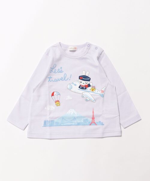 キャビンアテンダントになったうさぎのmimiちゃんととりのpiouちゃんが目を引く天竺素材の長袖Tシャツ。Tシャツの下部分には、富士山、浅草の雷門、東京タワー、お台場といった観光名所がソフトなタッチでさりげなくプリントされています。爽やかな色目でまとまったおすすめのアイテムです。80-90cmは左肩開き仕様です。